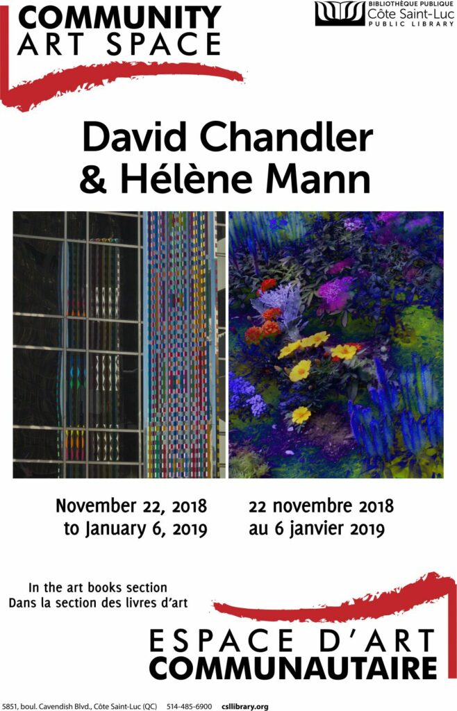 The Côte Saint-Luc PublicLibrary regularly has superb displays of art work from our very own residents. Through January 6, David Chandler and Hélène Mann are the focus of attention in our Community Art Space. I strongly recommend you pay a visit.
