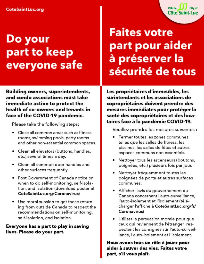 The city has now produced flyers and these are being posted in every building. I have included them on this blog. Citizens of Côte Saint-Luc understand how important this is. Council is meeting on a daily basis and communicating multiple times per day. Let’s all work on this together for a large outbreak in our community, with such a large percentage of senior citizens, would be devastating.