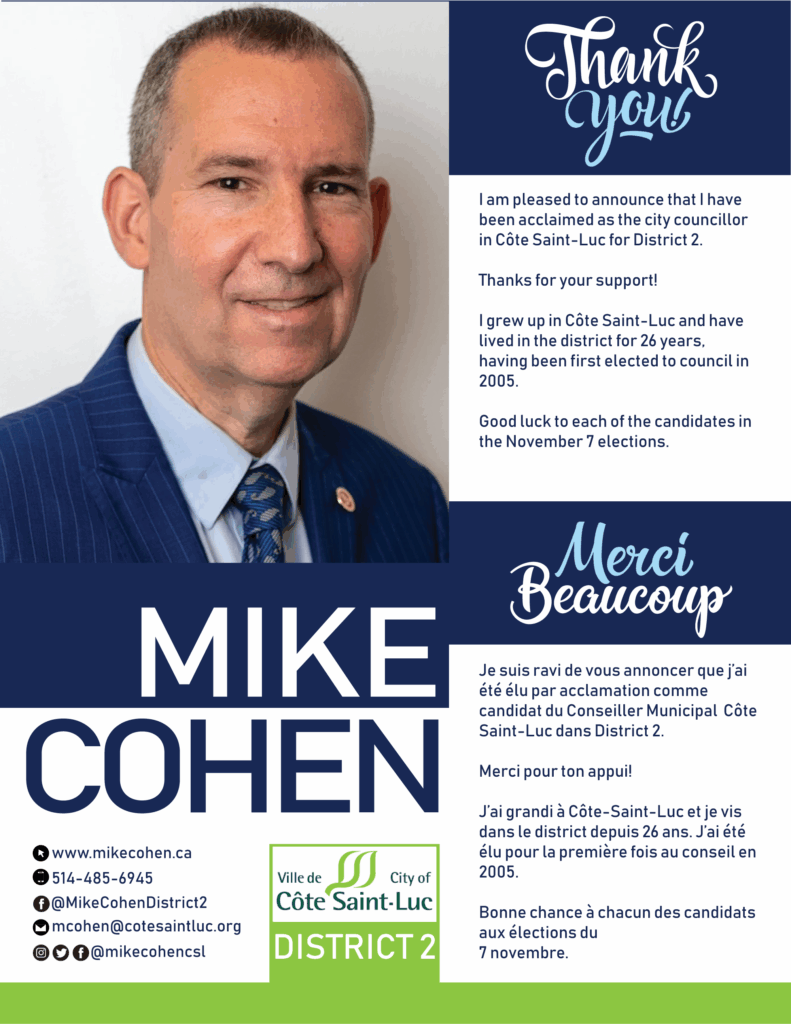 I have been re-elected by acclamation/Je suis ravi de vous annoncer que j’ai été élu par acclamation