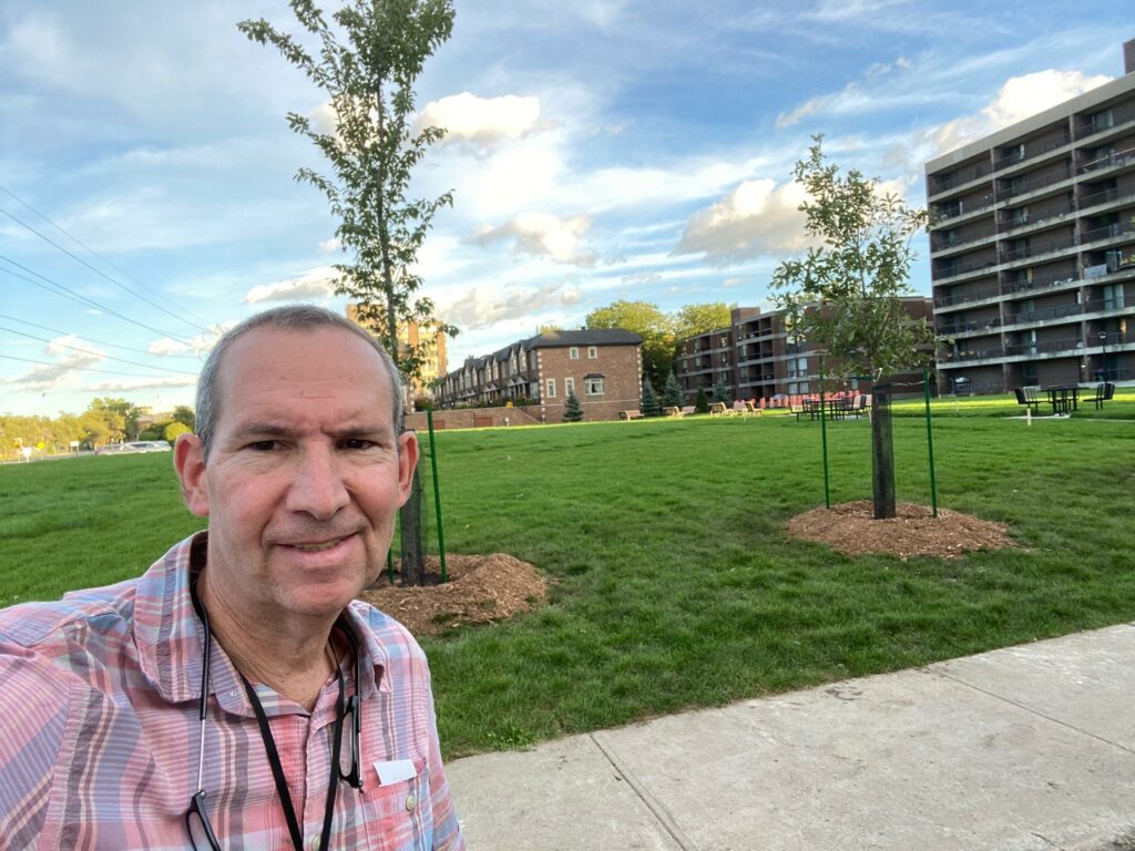 History will note that after having rented the greenspace to the developers of the Equinoxe buildings for three years, the property was left in poor condition.  Some litigation was necessary in order to not only restore the area, but vastly improve  it. That was indeed done by our Public Works Department. Besides installing sod (instant grass), we have a pathway, new benches, picnic tables and trees. Lighting will be next.